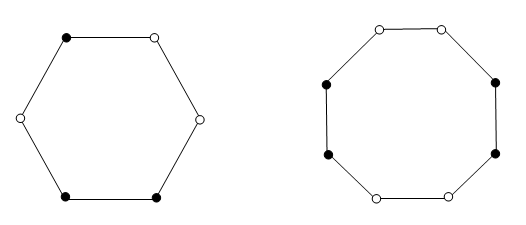 Существуют три вершины (A0, A3 и A5), каждая из которых образует вместе с вершинами A1 и A2 равнобедренный треугольник. Если в одной из них стоит белая фишка, то соответствующий треугольник – искомый. Если же во всех трёх этих вершинах черные фишки, то искомый треугольник – A3A0A5. б) См. в). в) Очевидно, что утвержение неверно для n= 3, 4. Оно неверно также для n= 6, 8 (см. рис.). Докажем, что оно верно для всех n≥ 9.