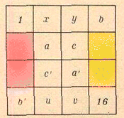 Поэтому нам нужно доказать, что в квадратах, удовлетворяющих нашему условию, сумма чисел, симметричных относительно центра, равна 17. Будем считать, что 1 стоит в верхнем левом углу, а 16 – в правом нижнем, тогда два других числа на этой же диагонали – обозначим их через a и a' – удовлетворяют равенству a + a' = 17. Условимся всегда число, дополняющее число x до 17, обозначать через x': x' = 17 – x.