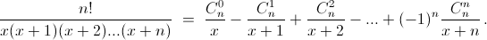 где Ak – некоторые числа. Умножим обе части на x(x + 1)...(x + n) и подставим x = –k. Тогда справа все слагаемые, кроме одного Ak(–k)(–k + 1)...·(–1)·1·2·...(n – k) = Ak·(–1)k·k!(n – k)!, обратятся в нуль, и мы получаем
