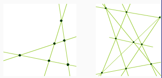 а) На рисунке слева изображены шесть точек, которые лежат по три на четырёх прямых. Докажите, что можно 24 разными способами отобразить это множество из шести точек на себя так, чтобы каждые три точки, лежащие на одной прямой, отобразились в три точки, лежащие на одной прямой.