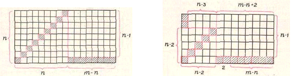 На рис. слева показано, как это сделать: из квадрата n×n выкинута диагональ, и квартеты размещены аналогично тому, как это сделано в квадрате 5×5; из прямоугольника (m–n)×n (m – n уже чётно) выкинута нижняя строка – тогда уже в прямоугольнике k×l = (m–n)×(n–1) и k и l – чётные, и как размещать квартеты очевидно. Всего – снова ¼ m(n – 1) квартетов.