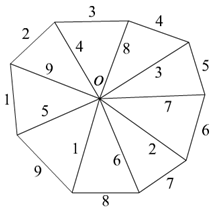 а) При n = 9 найти нумерацию, при которой сумма номеров сторон для всех треугольников A1OA2, ..., AnOA1 одинакова.