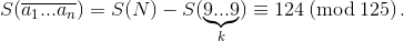 Таким образом, числа S(N) и S(N + 1) делятся на 125 тогда и только тогда, когда 9k ≡ 1 (mod 125) и S(a1...an) ≡ 124 (mod 125).