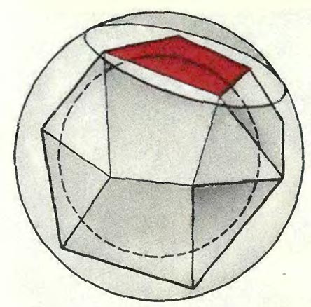 Второе решение.Поставим более общий вопрос: какое наименьшее число граней может иметь многогранник, описанный около сферы радиусаrи целиком лежащий в концентрической с ней сфере радиусаR>r. (Вот житейская ситуация, которая подсказала автору эту задачу: каким наименьшим числом прямолинейных взмахов ножа можно срезать верхний слой кожуры апельсина, не срезав при этом ни одного куска сердцевины? Очевидно, что после срезания всего верхнего слоя кожуры остаток будет многогранником, так как на его поверхности не будет ни одного закругленного участка, так что этот вопрос эквивалентен предыдущему.) Мы не знаем точного ответа на этот более общий вопрос, но докажем для числа граней некоторое неравенство, которое приr= 10,R= 11 показывает, чтоN> 22. Тем самым мы докажем, что если в условии задачи вместо 19-гранника взять 22-гранник, то утверждение задачи по-прежнему останется справедливым. Итак, пустьN-гранник описан около сферы радиусаrи целиком лежит внутри сферы радиуса R. Рассмотрим какую-нибудь его грань. Проходящая через неё плоскость отрезает от сферы шапочку (сегментную поверхность) высотыR-r. Ясно, что если построить шапочки для всех граней нашего многогранника, то их объединение покроет всю внешнюю сферу. Каждая изNшапочек есть сегментная поверхность высотыR−r, и, следовательно, имеет площадь 2π·R(R−r). Сумма площадей всех шапочек больше площади сферы. ПоэтомуN·2πR(R−r) > 4πR2, отсюдаN>${\frac{2R}{R-r}}$, в частности, приR= 11,r= 10 получаемN> 22. Интересно, что по любому набору шапочек, целиком покрывающих внешнюю сферу, можно построить многогранник, описанный около внутренней сферы. (Докажите!) Поэтому наш вопрос про минимальное число граней полностью эквивалентен следующему вопросу. Каково минимальное числоN=N(h) шапочек высотыh, целиком покрывающих сферу радиуса 1? (В исходной задачеh=${\frac{1}{11}}$.) Очевидно, чтоN(h) >${\frac{2}{h}}$, но это неравенство отражает просто тот факт, что сумма площадей шапочек больше площади сферы, в то время как интуитивно ясно, что приh< 1 шапочки должны довольно сильно перекрываться. И действительно, можно доказать, что при достаточно малыхhN(h) > 1, 2${\frac{2}{h}}$. Попробуйте сами доказать, например, что приh< 1
