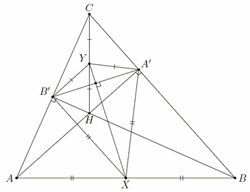Докажем, что точки X и Y лежат на серединном перпендикуляре к отрезку A'B'. Для этого достаточно проверить, что X и Y равноудалены от A' и B'. Первый способ. В треугольниках CA'H и CB'H медианы прямых углов равны половине гипотенузы, поэтому A'Y = ½ CH = B'Y. Аналогично