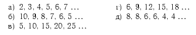 а) 8, 9 — числа идут подряд; б) 4, 3 — числа идут в обратном порядке; в) 25, 30 — последовательно записаны числа кратные 5; г) 21, 24 — последовательно записаны числа кратные 3; д) 2, 2 — каждые следующие два числа меньше предыдущих на 2.