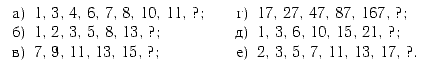 а) 12, 13. От натурального ряда оставляют одно число, следующее выкидывают, затем два числа, следующее выкидывают и т.д. б) 21, 34. Каждой следующее число — сумма двух предыдущих. в) 17, 19. Написаны последовательные нечётные числа. г) 327, 647. Записывается очередная степень двойки и сзади приписывается цифра 7. д) 28, 36. Записаны последовательные суммы чисел натурального ряда. е) 19, 23. Это — последовательность простых чисел.