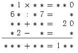 Расшифруйте ребус: замените звёздочки цифрами так, чтобы выполнялись равенства во всех строках и каждое число последней строки равнялось сумме чисел столбца, под которым оно расположено.