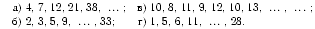 а) 71; чтобы получить очередное число, надо умножить предыдущее на 2 и вычесть порядковый номер предыдущего числа. б) 17; чтобы получить следующее число, надо умножить предыдущее на 2 и вычесть 1. в) 11 и 14; на чётных местах расположена последовательность 10, 11, 12,13,..., а на нечётных местах — последовательность 8, 9,10,.... г) 17; каждое следующее число равно сумме двух предыдущих.