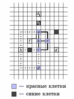 Рассмотрим семь столбцов, в которых расположены клетки пересечения l с семью вышеупомянутыми строками. Так как на последнем этапе С закрасил синим шесть клеток, то в одном из этих столбцов новых синих клеток нет (а все старые лежат над l). К закрашивает клетку a пересечения этого столбца с l (и с некоторой – i-й – строкой). В результате образовалось три квадрата с общей "вершиной" а и еще двумя красными "вершинами" – на l и в i-й строке. Следующим ходом К "замкнёт" один из этих квадратов: С сможет "обезопасить" только два из них.