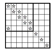 б) Расставим звёздочки так, как показано на рисунке: 2n – по диагонали, ещё n – на пересечении i-й строки с (i+1)-м столбцом (i = 1, 2, ..., n) и последнюю – на пересечении (n + 1)-й строки с первым столбцом.