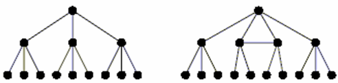 а) В качестве примера достаточно рассмотреть четырёхмерный куб: расположим города в его вершинах, а дороги проведём по ребрам и главным диагоналям. Другими словами, занумеруем города четырёхзначными двоичными числами от 0000 до 1111 и проведём дороги между городами, номера которых различаются ровно в одном разряде, и между городами, номера которых различаются во всех разрядах. б) Предположим, что такая система дорог построена. Рисунок слева показывает, что если из города выходит не более трёх дорог, то из него можно попасть максимум в 12 городов. Значит, из каждого города выходит ровно четыре дороги. Рисунок справа показывает, что если три дороги образуют треугольник, то из города в его вершине можно попасть не более чем в 14 других городов.