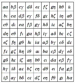 1) каждая клетка содержит по одной латинской и по одной греческой букве;