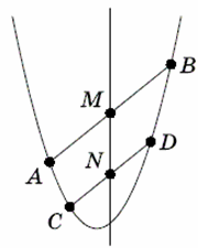 Докажем следующую лемму. Лемма. Пусть M и N – середины двух параллельных хорд параболы. Тогда прямая MN параллельна оси параболы (рис. 1).