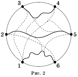 Рассмотрим тройку путей 1 → i, 2 → j, 3 → k, где (i, j, k) – некоторая перестановка (4, 5, 6). Если какие-то два из них имеют хоть одну общую точку, то выберем самую раннюю из них M (ближайшую к порту 1 на пути 1 → i или, если 1 → i не пересекается с двумя другими путями, ближайшую к порту 2 на пути 2 → j) и поменяем "хвосты" двух путей, проходящих через эту точку. (Если через M проходят все три пути 1 → i, 2 → j, 3 → k, то меняем хвосты 1 → i и 2 → j.) Заметим, что чётность тройки при перемене хвостов меняется. Таким образом, имеется взаимно однозначное соответствие между чётными и нечётными тройками путей, имеющих точки пересечения. Каждая тройка не имеющих общих точек путей имеет вид 1 → 6, 2 → 5, 3 → 4 (рис. 2), то есть нечётна. Значит, нечётных троек не меньше. Отсюда следует требуемое неравенство.