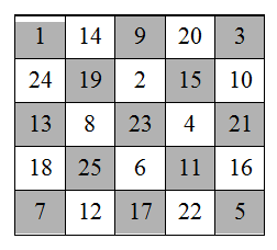 На клетчатой доске 5×5 расставили максимальное число шахматных коней так, чтобы они не били друг друга.