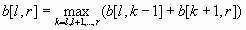 Заметим, во-первых, что не любая стратегия игрока приводит к нужному результату. Например, если в примере, разбиравшемся в условии задачи (rrrgggbbb и т.д.), стоимость буквы b будет больше стоимости буквы r, то только один из путей приводит к оптимальному результату: три раза забрать буквы gb. После некоторого размышления можно понять, что всевозможные т.н. "жадные" решения - делать самый выгодный ход, делать самый длинный ход, делать самый левый ход, и т.п. - также в большинстве случаев неверны. Перебирать же все варианты, для каждого из них - опять все варианты, и так далее - оказывается слишком медленным подходом.Для решения этой задачи применим динамическое программирование. В первой половине решения мы для каждого куска начальной последовательности фишек определим, можем ли мы забрать его целиком, не затрагивая при этом остальные фишки. Иными словами, для всех l и r найдем величину a[l,r], равную 1, если фишки с номерами (то есть позициями в начальном расположении, считая слева) с l по r игрок может за несколько действий все забрать себе, и 0 - в противном случае. Затем по этим данным во второй половине решения мы восстановим ответ к задаче.Во избежание путаницы будем называть последовательности, объявленные крупье (в отличие от начальной последовательности) словами.Вторая половина решения проще первой, поэтому начнём с неё. Пусть нам известны величины a[l,r]. Пусть тогда b[l,r] - это максимальная сумма денег, которую можно получить, играя только на отрезке с l-ой фишки по r-ую (то есть, не трогая остальных фишек). Ясно, что если a[l,r]=1, то b[l,r] - это просто сумма стоимостей всех фишек с l-ой по r-ую. Если же a[l,r]=0, то уже не удастся забрать все фишки, соответственно, какая-то из фишек должна остаться - пусть это фишка с номером k. Тогда заметим, что задача распадается на две - для фишек слева от k-ой и для фишек справа от неё, т.е. что b[l,r]=b[l,k-1]+b[k+1,r] (здесь и далее мы считаем, что для любого m b[m,m-1]=0). Но так как номер оставшейся фишки не фиксирован, то в действительности b[l,r] равно максимуму этих величин по всем k: