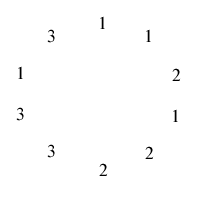 Расставьте по кругу четыре единицы, три двойки и три тройки так, чтобы сумма любых трёх подряд стоящих чисел не делилась на 3.