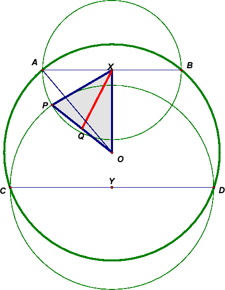 XQ² = ¼ (2OX² + 2XP² – OP²) = ¼ (2OX² + 2XA² – OP²) = ¼ (2R² – OP²) = YQ². Таким образом, Q равноудалена от точек X и Y, а, значит, и от прямых AB и CD (см. рис.).