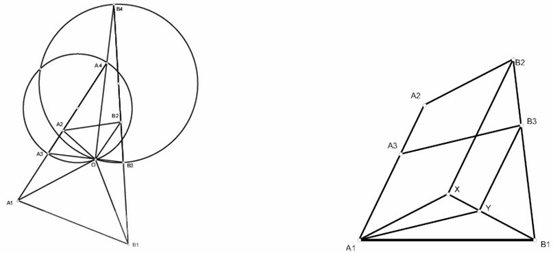 На плоскости даны два отрезка A1B1 и A2B2, причём A2B2/A1B1 = k < 1. На отрезке A1A2 взята точка A3, а на продолжении этого отрезка за точку А2 – точка А4 так, что A3А2/А3А1 = А4А2/А4А1 = k. Аналогично на отрезке В1В2 берётся точка В3, а на продолжении этого отрезка за точку В2 – точка В4 так, что