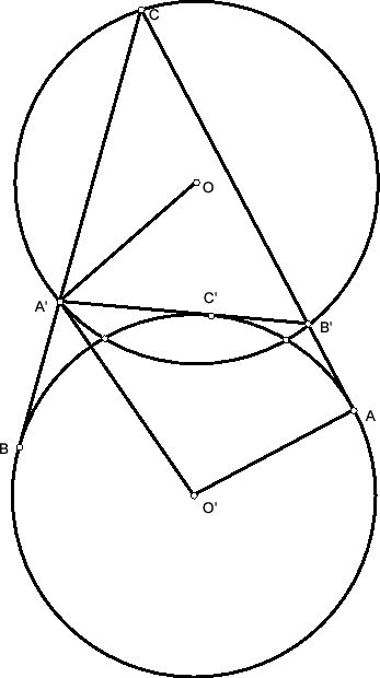 Следовательно, ∠A'O'A = ∠AO'C' + ½ C'O'B = ∠CB'A' + ½ CA'B', ∠O'A'O = ∠O'A'B' + ∠B'A'O = π/2 – ∠C'O'A' + π/2 – ∠BCA = π – ∠BCA – ½ CA'B' = ∠CB'A' + ½ CA'B'. Так как O'A = OA', AO'A'O – равнобедренная трапеция, и AA' = OO' =