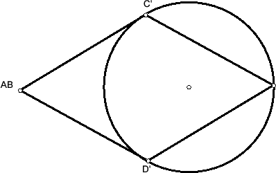 Так как отрезки AA' и BB' пересекаются, прямые AB и A'B' тоже пересекаются или параллельны. Обозначим их точку пересечения (возможно, бесконечно удалённую) через P. Так как P лежит вне двугранного угла при ребре CD, плоскость CDP не пересекает вписанную сферу. Поэтому существует проективное преобразование, сохраняющее сферу и переводящее эту плоскость в бесконечно удалённую. В результате этого преобразования отрезок A'B' станет диаметром сферы, а AB будет ему параллелен. Так как точка пересечения AA' и BB' лежит на сфере, расстояние от её центра до AB равно удвоенному радиусу (на рис. слева показана проекция на плоскость ABA'B').