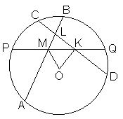 В окружности с центром O проведены три равные хорды AB, CD и PQ (см. рисунок). Докажите, что MOK равен половине угла BLD.