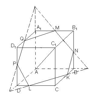 Первый способ. Выберем плоскость проекции так, чтобы она проходила через центр куба. Сечением куба этой плоскостью является правильный шестиугольник MNKLPQ (рис. слева). Проекцией куба на эту плоскость является шестиугольник A'1B1B'C'D'D'1 (рис. в центре), вершины которого являются центрами правильных треугольников, построенных на сторонах шестиугольника MNKLPQ, поэтому полученный шестиугольник также является правильным, причём вершины A и C1 куба проектируются в его центр. Проекцией грани АА1В1В является параллелограмм A'A'1B'1B'. Его площадь в три раза меньше площади проекции куба.