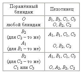 сведём в таблицу. В левом её столбце – блиндажи, по которым стреляет пушка, в правом – блиндажи, куда после этого может перебежать пехотинец. Горизонтальными линиями разделены различные варианты. Некоторые случаи не разобраны (про них написано "то же"). Это означает, что получается та же ситуация с точностью до перестановки ветвей. Каждый случай разбирается до повторения ситуации, которая уже встречалась.