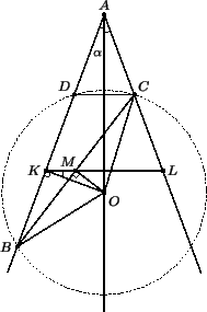 Пусть теперь AB ≠ AC (см. рис.). Пусть D – точка, симметричная точке C относительно биссектрисы AO. Тогда D лежит на луче AB и OD = OC = OB. Опустим перпендикуляр OK на BD. Так как OB = OD, то BK = KD и, следовательно, KM – средняя линия треугольника BDC. Поэтому KM || DC и