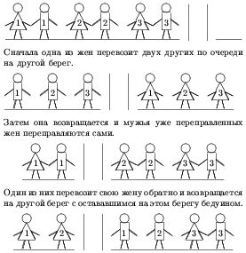 К берегу Нила подошла компания из шести человек: три бедуина, каждый со своей женой. У берега находится лодка с вёслами, которая выдерживает только двух человек. Бедуин не может допустить, чтобы его жена находилась без него в обществе другого мужчины. Может ли вся компания переправиться на другой берег?
