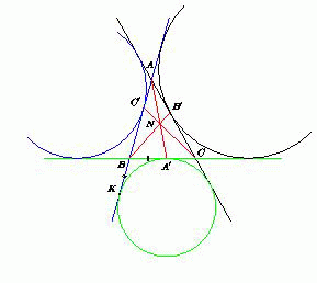 Рассмотрим треугольник ABC . Обозначим BC=a , AC=b , AB=a . Пусть A' , B' , C' – точки касания вневписанных окружностей треугольника со сторонами BC , AC , AB соответственно, K – точка касания первой из этих окружностей с продолжением стороны AB , p – полупериметр треугольника.