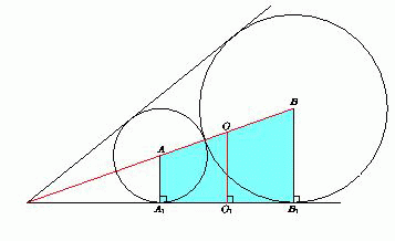 AB = r + R. Значит, радиус окружности с диаметром AB равен ½ (R + r). С другой стороны, отрезок OO1 – средняя линия прямоугольной трапеции AA1B1B. Поэтому OO1 = ½ (AA1 + BB1) = ½ (R + r) = ½ AB. Следовательно, окружность с диаметром AB касается стороны угла.