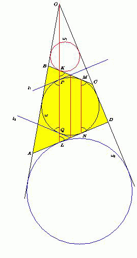 Пусть для определённости точка O лежит на продолжении отрезка AB за точку B. Обозначим через P и Q точки пересечения KL с окружностью ω, через M и N – точки касания сторон BC и AD с ω. Проведём касательные l1 и l2 к ω в точках P и Q. Обозначим через α угол между касательной l1 (или l2) и хордой PQ.