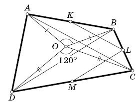 Дан выпуклый четырёхугольник ABCD и точка O внутри него. Известно, что ∠AOB = ∠COD = 120°, AO = OB и CO = OD. Пусть K, L и M – середины отрезков AB, BC и CD соответственно. Докажите, что