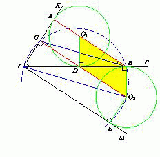 Поскольку O1D = O2B и O1D || O2B (как перпендикуляры к прямой LP), то DO1BO2 – параллелограмм, поэтому CO2 || AB || LE, где E – точка касания окружности S2 с прямой LM. Значит, CLEO2 – прямоугольник. Поэтому CL = O2E = O2B. Точки C и B лежат на окружности с диаметром LO2. Вписанные углы CBL и BCO2 этой окружности опираются на равные хорды CL и O2B и поэтому равны, а так как CO2 || AB, то ∠CBL = ∠BCO2 = ∠ABC.