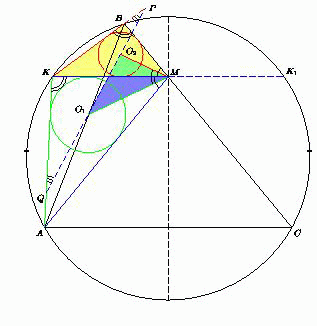 Серединный перпендикуляр к стороне AC треугольника ABC пересекает сторону BC в точке M. Биссектриса угла AMB пересекает описанную окружность треугольника ABC в точке K. Докажите, что прямая, проходящая через центры вписанных окружностей треугольников AKM и BKM, перпендикулярна биссектрисе угла AKB.
