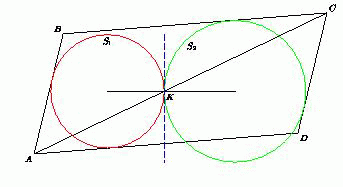 Пусть другой точке K' диагонали AC соответствует другая пара окружностей s1' и s2' . Окружности s1и s1' вписаны в угол BAD , следовательно, гомотетичны с центром в точке A , а значит, их касательные, проведённые в точках K и K' соответственно, параллельны. Тогда параллельны и перпендикулярные им линии центров пар окружностей s1, s2и s1' и s2' .