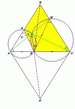 Значит, ∠ENC = ∠KAE. Поэтому точки A, N, K, E лежат на одной окружности. Аналогично, точки C, M, K, E также лежат на одной окружности. Следовательно, ∠AKE = ∠ANE = α = ∠EMC = ∠CKE, то есть KE – биссектриса угла AKC. Поскольку ∠ADC = 180° – 2α, а ∠AKC = 2α, четырёхугольник AKCD – вписанный. Продолжение биссектрисы KE треугольника AKC пересекает описанную окружность этого четырёхугольника в середине дуги AC, не содержащей точки K, то есть в точке D.