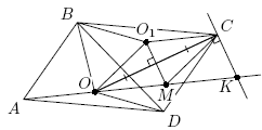 Угол при вершине A треугольника ABC – острый, поэтому вершина A и центр O описанной окружности этого треугольника лежат по одну сторону от прямой BD. ∠BOD = 2∠BAD = 120° = 180° – ∠BCD. Значит, четырёхугольник OBCD – вписанный. Поскольку вписанные углы BCO и DCO опираются на равные хорды OB и OD, то CO – биссектриса угла BCD, а так как CK – биссектриса смежного с ним угла, то ∠OCK = 90°.