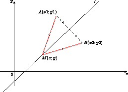 A(x1;y1) и B(x2;y2), симметричные относительно прямой l. Поскольку прямая l — серединный перпендикуляр к отрезку AB, то произвольная точка M(x;y) этой прямой равноудалена от концов отрезка AB. Координаты этой точки удовлетворяют уравнению