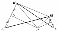 KLMN – выпуклый четырёхугольник, в котором равны углы K и L. Серединные перпендикуляры к сторонам KN и LM пересекаются на стороне KL.