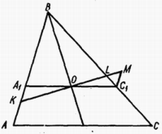 C1M || AB и продолжим OL до пересечения с C1M в точке M. Треугольник OMC1 равен треугольнику A1OK (по стороне и двум углам), а треугольник OC1L составляет лишь его часть. Аналогичное построение можно провести для любого другого треугольника. Кроме того, ясно, что на долю второй части данного треугольника остаётся тоже не менее 400: поворачивая прямую KL вокруг точки O, мы будем получать треугольники до тех пор, пока прямая KL не совпадёт с одной из медиан AO или OC. Тогда площадь треугольника будет наибольшей и равной половине площади данного треугольника, то есть 450. Значит, оставшаяся часть будет не менее 450.