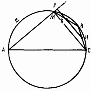 Проведём диаметр AC и точку B соединим с точкой C (см. рис.). Продолжим прямую PK до пересечения с прямой BC в точке H. ∠AMC = 90°, значит,