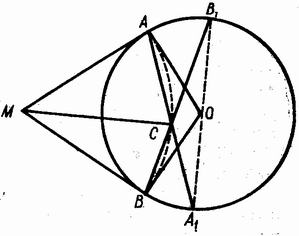 MA и MB – касательные к окружности O,; C – точка внутри окружности, лежащая на дуге AB с центром в точке M . Доказать, что отличные от A и B точки пересечения прямых AC и BC с окружностью O лежат на противоположных концах одного диаметра.