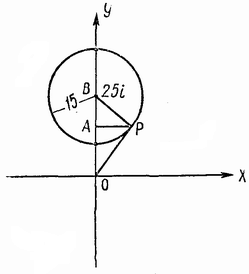 Все комплексные числа, удовлетворяющие условию |p – 25i| ≤ 15, изображаются точками, лежащими внутри и на окружности круга с центром в точке 25i и радиусом 15 (см. рис.). Наименьший аргумент будет у правой точки касания радиус-вектора и окружности. Найдём координаты точки P касания OP с окружностью. Из прямоугольного треугольника OPB, OP² = OB² – BP² = 25² – 15² = 20² (OB = 25, BP = 15), PA ⊥ OB. Из прямоугольного треугольника OPB: AP = BP·OP/OB , AO² = OP² – AP² = 256.
