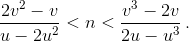 Применим теперь метод Штурма. Пусть P – среднее арифметическое чисел p(x1), p(x2), ..., p(xn). Если среди этих чисел есть неравные, то найдутся такие i, j, что p(xi) < P и p(xj) > P. Сблизим xi и xj так, чтобы сумма p(xi) + p(xj) не изменилась, а хотя бы одно из слагаемых стало равным P (это возможно ввиду монотонности и непрерывности p(x) на полуинтервале (0, ¼]). По лемме сумма q(xi) + q(xj) возрастёт. Будем повторять операцию, пока все p(xi) не станут равны P. Осталось выяснить, при каком минимальном n существуют такие u ≤ ½, v > 4, что 2(nu² + v²) < nu + v, 2(nu + v) < (nu³ + v³).