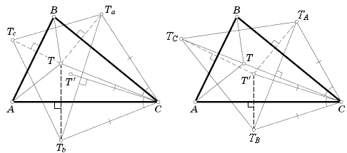 Пусть теперь TA, TB, TC – точки, симметричные T' относительно BC, CA, AB . Рассуждая, как выше, получаем, что T – центр описанной окружности треугольника TATBTC, а прямые AT, BT, CT являются серединными перпендикулярами к его сторонам. Значит, углы этого треугольника равны 60°, то есть этот треугольник правильный. Следовательно, точки TA, TB, TC лежат соответственно на прямых AT, BT, CT, а симметричные им прямые проходят через T' (рис. справа).