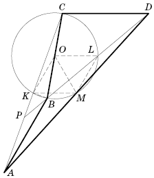 Решение 1: Пусть O, K, L – середины отрезков BC, AC и BD соответственно, P – точка пересечения прямых AC и BD. Точки K, L различны (иначе ABCD – ромб и