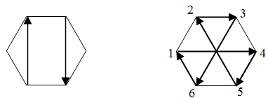 Решение 2: Взяв вершины 2n-угольника (n ≥ 3) через одну, получим два правильных n-угольника M1 и M2. Предположим, что мы умеем решать задачу для правильного n-угольника. Для того чтобы решить её для 2n-угольника, достаточно расставить стрелки на сторонах и диагоналях каждого из многоугольников M1 и M2, а потом из каждой вершины M1 провести векторы во все вершины M2. Последняя система векторов переходит в себя при повороте на угол 2π/n вокруг центра, следовательно, её сумма равна 0 (рис. слева).